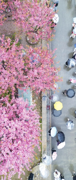 东湖樱花园内同样热闹。五颜六色的雨伞在花间移动,汇成春日盛景。不少游客收起雨伞,静享细雨拂面的清爽。“雨中的樱花更有一种柔美的气质”,带着家人前来赏樱的游客李女士边走边拍,十分惬意。长沙游客周先生则对带雨花瓣赞不绝口:“雨中赏樱别有一番风味。花瓣上的雨珠像珍珠一样,拍照特别好看。用手机微距拍,每一颗水珠里都倒映着一片小花瓣,特别精致”。