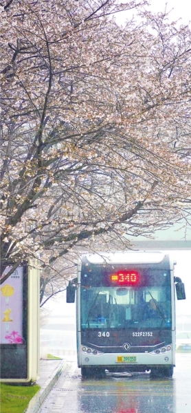 珞喻东路大黄村公交车站周围的樱花刚刚绽放,市民抬头就可欣赏到浪漫的雨中樱花。