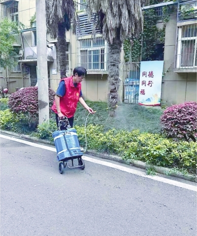 世茂物业工作人员对金江公寓公共区域进行全面消杀。