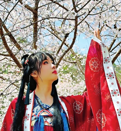 在黄陂区蔡店街道清凉寨景区,武汉之巅的野樱花如霞似锦。引人驻足的不仅是花海,更有观景台上身着古装的“赏花人”:广袖长裙、箭衣束发,在镜头前低吟念白、翩然转身。镜头里上演着跨越时空的儿女情长,镜头外是高山春日的盎然。