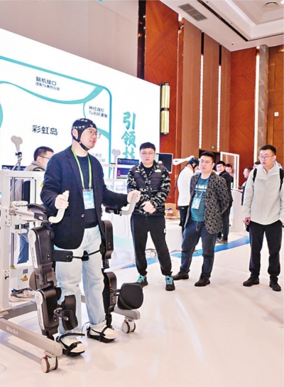 大会同步举行无创脑机与神经调控新技术、新产品展示。在大会展区,人工智能元素随处可见,有的企业直接将“AI开启康复新模式”打在宣传展板上,吸引众多参会者围观。