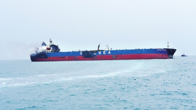 这是3月12日在伊拉克巴士拉省附近海域拍摄的遭袭油轮。