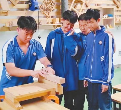 同学们在木工实训车间动手实操,体验木工工艺的美妙。