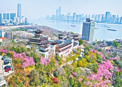 龟山樱花栈道游人摩肩接踵,樱花簇拥的知音殿与汉口、武昌高楼隔江相望。