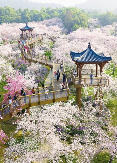 武汉东湖樱花园花海如云,景致如画。