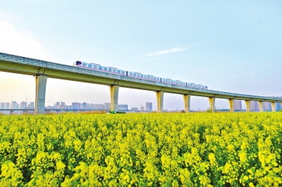 武汉地铁16号线穿梭于金色花海。