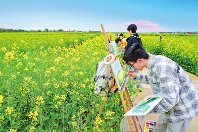 武汉生物工程学院稻香莓语现代农业产业园内,300余亩油菜花迎来了盛花期。学生们在花田边写生,用画笔记录这美丽的春景。