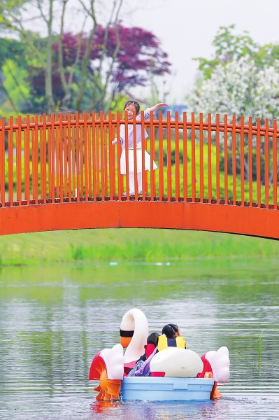 4月5日,不少游客带着孩子来到杜公湖国家湿地公园踏青。
