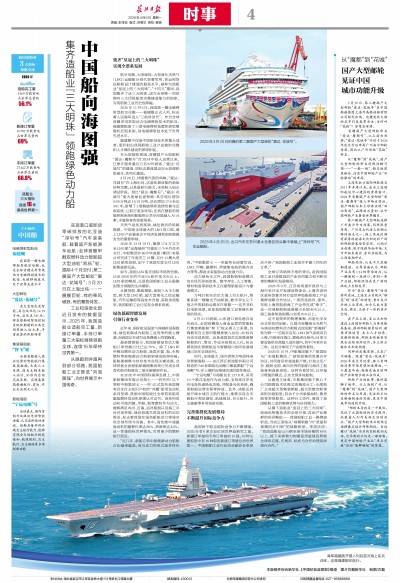 实现港口装卸货零碳排放的比亚迪“深圳号”汽车滚装船,载着国产新能源车远航;全球首艘甲醇双燃料动力智能超大型油轮“凯拓”轮,提前4个月交付;第二艘国产大型邮轮“爱达·花城号”,3月20日在上海出坞……一艘艘巨轮,有的乘风破浪,有的蓄势待发。