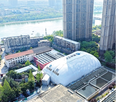“我们让水厂改造全程‘零污染、低干扰’。”项目现场负责人李安介绍,“白罩子”学名叫基坑气膜,这是湖北省市政工程施工领域首次使用大型膜结构全封闭罩棚。