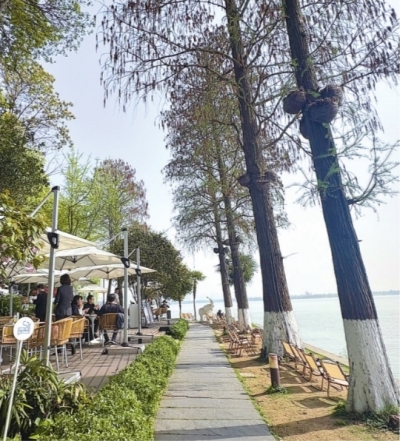 不仅是这家餐厅,旁边的两家咖啡馆同样因“环境好、能出片”吸引了不少年轻人。北京游客杨小姐举着一杯咖啡,让家人在湖边为她拍下一张侧脸照,镜头延伸出去,背后就是东湖。杨小姐满意地说,“必须发朋友圈的九宫格”。