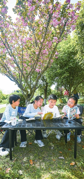 4月5日,南太子湖公园里,几名小朋友在樱花树下阅读。
