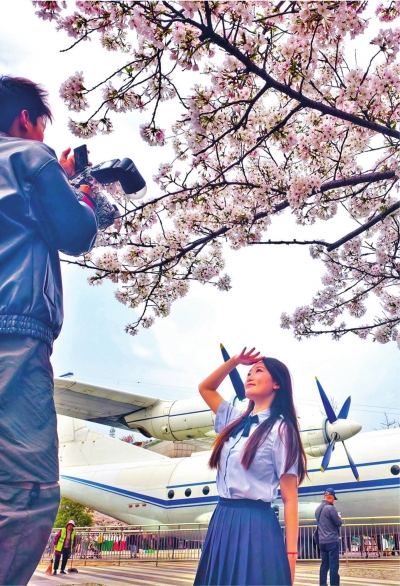 汉口王家墩公园,市民游客在樱花掩映的飞机前拍照。