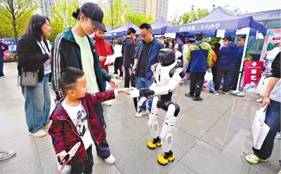 室外展区,一名小孩和机器人互动。