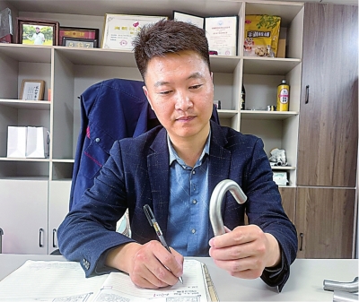 柏元海在办公室内思考航空管件生产工艺。
