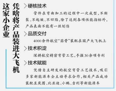 近年来,柏元海带领团队加工交付的4000余件航空“筋骨”装配在国产大飞机上。在公司样品展示区,柏元海向长江日报记者一一介绍说,这是飞机起落架油路导管、引气管、主支撑管……各种管件多达几十种,材质有铝合金、钛合金等。