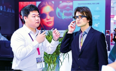 海外嘉宾(右)试戴湖北臣博视人工智能科技有限公司研发的智能眼镜。