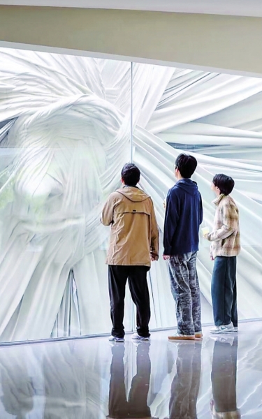 长江日报记者在麓洲艺展中心看到,这座名为“漪·院”的建筑采用流线型设计,外立面由超白玻璃与弧形铝板构成,呈现无规则双曲面形态。建筑与麓湖通过玻璃幕墙衔接,成为武汉覆土建筑新地标。