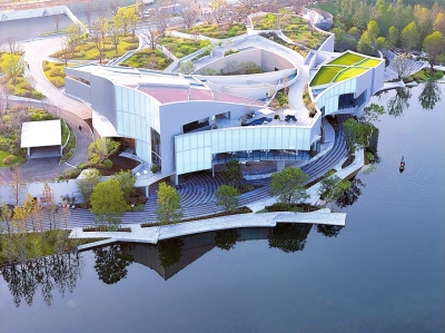 麓洲艺展中心与麓湖通过玻璃幕墙衔接。