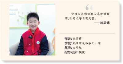 徐昊博有一个专属记事本,从一年级起,他每天都会记录新鲜事。“我喜欢去东湖骑车,也喜欢仰望星空,还喜欢观察小动物,比如一只蚂蚁如何进食……”生活中那些看似普通的场景,他都会捕捉细节记下来,空闲时反复翻看,这些都成了他写作时最鲜活的素材。