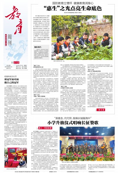 长江日报讯(记者杨幸慈 通讯员周怡飞)“英雄血,代代同,我铸长城瀚海中……拔剑起,站如松,且看今朝起鲲鹏!”近日,在武汉经济技术开发区三角湖小学升旗仪式上,这首由孩子们热血激昂合唱的歌曲赢得全场持续掌声。这是该校六(2)雏鹰中队对革命先辈的献礼,也是该校纪念长征胜利90周年系列活动的一个缩影。