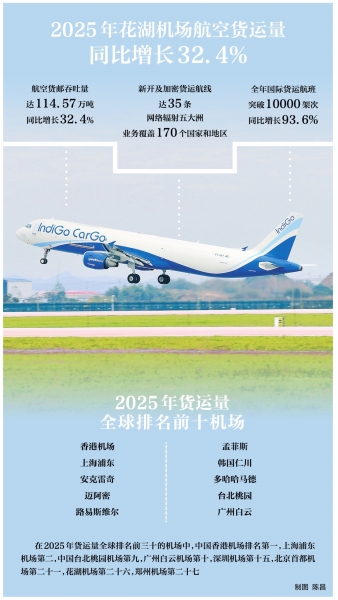 长江日报讯(记者刘海锋)近日,国际机场协会(ACI)和国际航空运输协会(IATA)发布2025年全球机场航空货运量排名。在这份最新榜单中,中国航空物流力量表现极为抢眼:中国香港、上海浦东机场稳居全球前二;而花湖国际机场(简称花湖机场)则以32.4%的同比增速,成为全球货运枢纽“增速冠军”,航空货邮吞吐量达114.57万吨,排名为全球第26位。同期,全球航空货运量整体增速仅为2.9%。