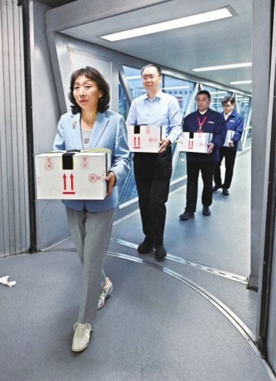 2025年5月18日,护送文物归国的工作人员手捧装载着子弹库帛书的保护箱走出客机。