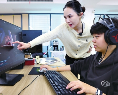 爆款AI短片《霍去病》的导演杨涵涵(左)和同事沟通细节。