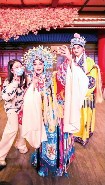 体验沉浸式戏游版汉剧《贵妃醉酒》的游客和演员合影。