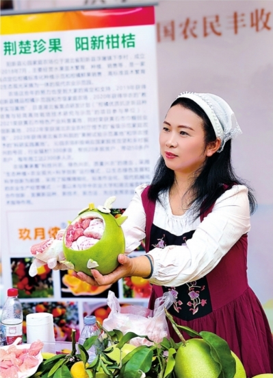 王水歆在丰收节上展示果园收获的各种柑橘。