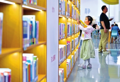 东西湖区图书馆,一名小学生正在寻找自己喜爱的读物。