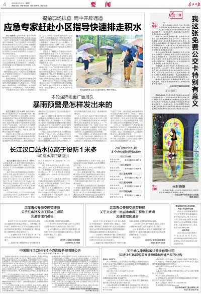6月28日20时,长江汉口站水位超过设防水位1米多,达到26.03米。预计汉口站水位29日26.39米,30日27.01米,7月1日27.01米,2日27.04米,3日27.08米。