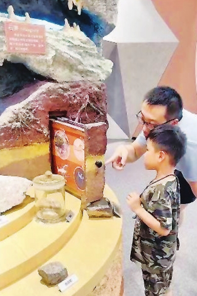 “快看,这里又有一个洞!”在岩溶主题展区里,小宝兴奋地大喊。他的小眼睛像探照灯一样,一下子就找到了七八个小洞。每找到一个洞,他都会探头往里瞅,仔细地观察里面的岩矿标本,那认真的小模样,好像真是一个小小地质家。这个展区里不仅藏有岩矿标本,还有动植物的化石景观。最有趣的是,小宝和爸爸还发现了一个小盲盒——抽拉式互动展板,抽拉开竟是一组岩矿内生物的图示。几个小时下来,儿子学到了不少地质知识。