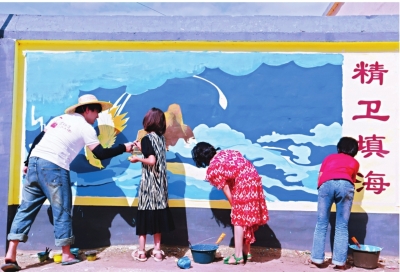墙上画的是成语故事精卫填海,画中的蓝色大海与头顶湛蓝的天空相连。