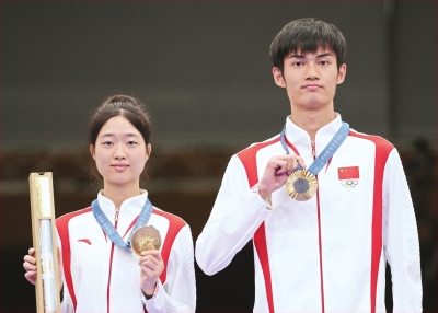 7月27日,中国选手黄雨婷(左)/盛李豪夺得射击10米气步枪混合团体决赛冠军,赢得巴黎奥运会首枚金牌。