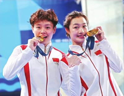 7月27日,在巴黎奥运会跳水女子双人3米板决赛中,中国选手昌雅妮(右)/陈艺文夺得金牌。