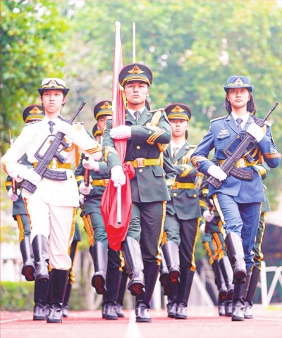 我们在操场上站过军姿,在长廊中踢过正步,在教室里唱过军歌。在一声声号令中,我们飞速进步。每天,雷打不动,坚持早上7时30分升旗、傍晚5时30分降旗;每周一,坚持举行全校师生参与的升国旗仪式;每年元旦、国庆节,坚持举行隆重的升旗仪式。