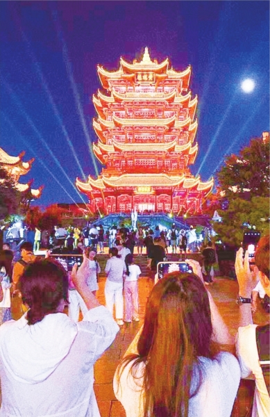 “今月曾经照古人”。一轮皓月映衬下,千年名楼黄鹤楼仙气飘飘,是赏月的最佳去处。中秋假期,长江日报记者走进黄鹤楼公园看到,夜色中的黄鹤楼上高悬一轮皎皎明月,广场上、主楼上,游客们抬头望月、拍月。鹅池畔,一曲《天宫舞曲》,“嫦娥仙子”轻启广袖,于月华之下翩翩起舞,带着大家来一场古今穿越的赏月之旅。在千禧钟处,还新增黄鹤揽月体验空间,家长们带着孩子用高倍天文望远镜看月亮,为生活平添几分浪漫。