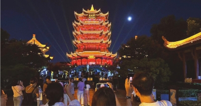 “今月曾经照古人”。一轮皓月映衬下,千年名楼黄鹤楼仙气飘飘,是赏月的最佳去处。中秋假期,长江日报记者走进黄鹤楼公园看到,夜色中的黄鹤楼上高悬一轮皎皎明月,广场上、主楼上,游客们抬头望月、拍月。鹅池畔,一曲《天宫舞曲》,“嫦娥仙子”轻启广袖,于月华之下翩翩起舞,带着大家来一场古今穿越的赏月之旅。在千禧钟处,还新增黄鹤揽月体验空间,家长们带着孩子用高倍天文望远镜看月亮,为生活平添几分浪漫。