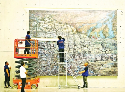 探馆当天,武汉籍艺术家曾梵志的作品正在开箱、上墙。曾梵志的“闪烁绘画”系列创作去年在上海首展,构成了一种很鲜明的绘画语言,此次参展的作品是“闪烁绘画”系列的代表作,近期刚创作完成,颜料犹未干透,为首次展出。在武汉美术馆(琴台馆)A厅,曾梵志的这件布面油画作品由12件局部画拼装而成,布展人员现场组装上墙,高6米、宽4.5米大尺幅画作颇为震撼。画面中,线条上的亮色与画面中施加的鲜红、钴蓝色相呼应。整幅作品笔力劲健、层次丰富,苍凉的风景通过叠加错位的方式呈现。