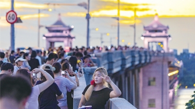 今年7月以来,来武汉旅游,“在长江大桥追日落”成为全国游客“最浪漫的事”。“站在长江大桥上,迎面看是绝美落日和龟山电视塔同框,回头看是巍峨的黄鹤楼,在金色光芒下熠熠生辉,宽阔的江面上还可以远眺杨泗港长江大桥、长江二桥,处处是景。”