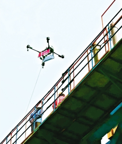 10月18日上午10时58分,伴随着“起飞!”的指令,无人机从大桥主塔塔顶腾空而起,载着先导索飞过江面,仅10分钟后,武汉双柳长江大桥南北两岸主塔顺利完成“牵手”,为大桥后续牵引系统施工、猫道及主缆架设奠定了基础。