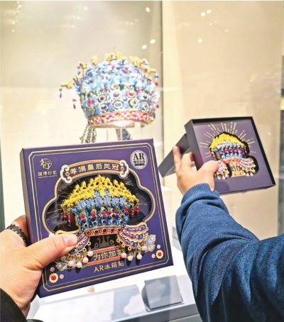 记者紧接着赶到国博地下一层的“古代中国基本陈列”,排队参观孝端皇后凤冠文物,掏出新买的冰箱贴,打卡拍照。
