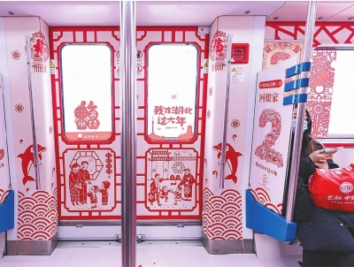 想在武汉打卡春晚武汉剪纸同款,游客还可坐上地铁1号线的“非遗贺新春”地铁专列。“武汉剪纸”省级代表性传承人沈松柏及设计团队耗时一个半月,以城市地标长卷为外包车衣、以春节年俗为车内设计,带着传统文化的浓郁气息与新春的美好祝福。“非遗贺新春”地铁专列车身上,黄鹤楼的诗意、长江的雄浑、吉庆街的烟火气息等交织在一起,呈现出一幅生动的武汉城市图景。