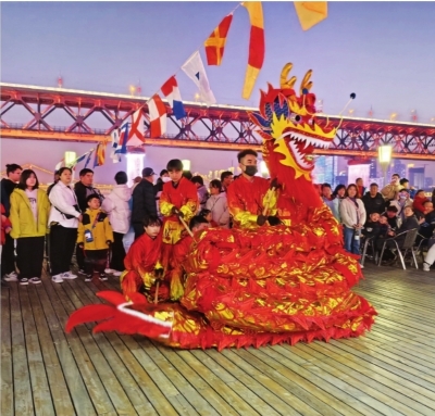 据悉,春节期间,武汉文旅集团两江游览为游客准备了丰盛的文旅“大餐”,主题鲜明、氛围感拉满的一系列特色活动让游客们看得过瘾、游得尽兴。通过“李白和他朋友的故事”情景剧的演绎,带领游客重温李白经典诗词,体验不一样的长江文化;英雄岳飞“穿越”到黄鹤楼号游船,带领游客沉浸式体验沙场阅兵、感受岳飞“再续汉阳游”的豪迈;“金蛇闹春,蛇舞两江”游园会让游客在游船上尽情体验春节民俗文化,浓厚的节日氛围为游客送去新春的祝福;打年兽、大转盘等轻松、欢快的小游戏不仅为游客准备了新年小礼品,游船上各式精美的小道具还为游客送去喜庆与吉祥。