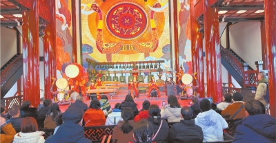 在楚天台三层“楚宫雅乐”,入口处仿制版虎座凤鸟悬鼓楚韵十足,吸引了许多游客合影留念。“看,我打卡了春晚同款!”一大早,游客吴昊和家人登上345级台阶,成为最早一批进入楚天台的游客。“早就听闻从山麓到楚天台共有345级台阶,寓意着步步高,我们特意在新春第一天来登高,图个新年好兆头。”吴昊说。