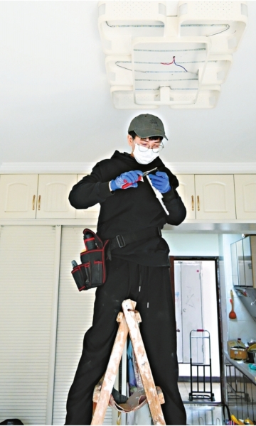 在床上铺好防尘罩,踩上自带的架梯,陈哲涵熟练地用螺丝刀拆旧灯。