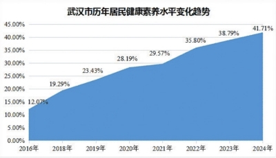 日前,武汉市疾控中心发布《武汉市2024年居民健康素养监测报告》显示:2024年武汉市居民总体健康素养水平为41.71%,武汉市居民健康素养水平持续提升,提前完成《“健康湖北2030”行动纲要》提出的“到2030年湖北省居民健康素养水平提高到35%”的目标。
