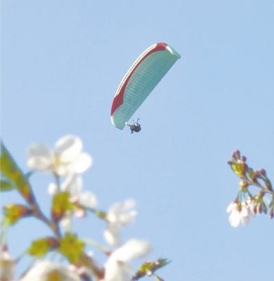 这是陈曦第一次体验空中项目,也是他第一次在空中赏花。“在空中看到哪里樱花开得好,可以让同乘的教练往那个方向飘,一边拍照一边欣赏美景。我下次还要来体验。”