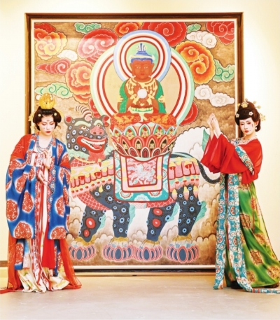 巨大的画作在灯光的映衬下,更显古老东方的神秘气息。在“千年微笑”展厅,我们与“东方微笑”不期而遇。来自麦积山石窟第44窟的西魏皇后乙弗氏像让我们不禁屏住了呼吸。画中人物低眉垂目、唇角含笑、和蔼可亲的神态宛如一位慈爱的母亲,千年之后依然能触动人心。而临摹自第133窟小沙弥壁画的作品,同样令人惊叹。这幅作品中,小沙弥身穿宽袍大袖,双唇紧闭而嘴角上扬,那天真烂漫的“微微一笑”,仿佛什么烦恼都被治愈了。